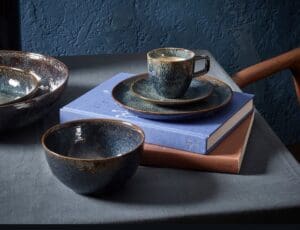 Mielo onderscheidt zich van andere collecties door het prachtige materiaalreliëf dat de collectie kenmerkt. Het gehamerde patroon en glanzende afwerking aan de binnen- en buitenzijde zorgen voor een unieke tafelervaring. Het verbluffende reactieve glazuur genereert een prachtig kleurenpalet met saffierblauwe, oceaangroene en kastanjebruine tinten. De uiterst praktische vormen vervolledigen het plaatje. Bovendien zijn de items bestand tegen krassen en verkleuren.